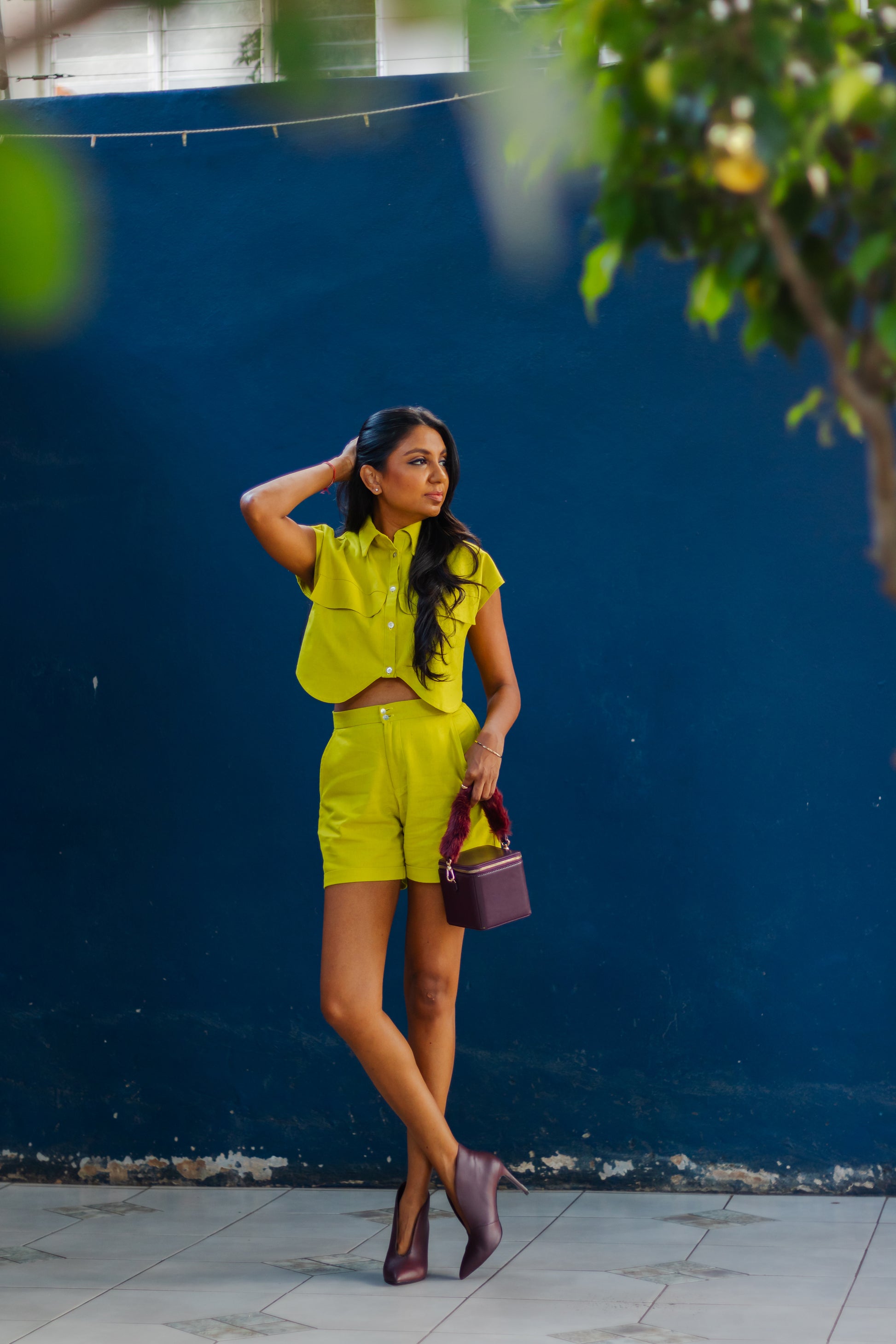 - Front : Designed to sit on the waistband of the shorts, with scalloped edges.