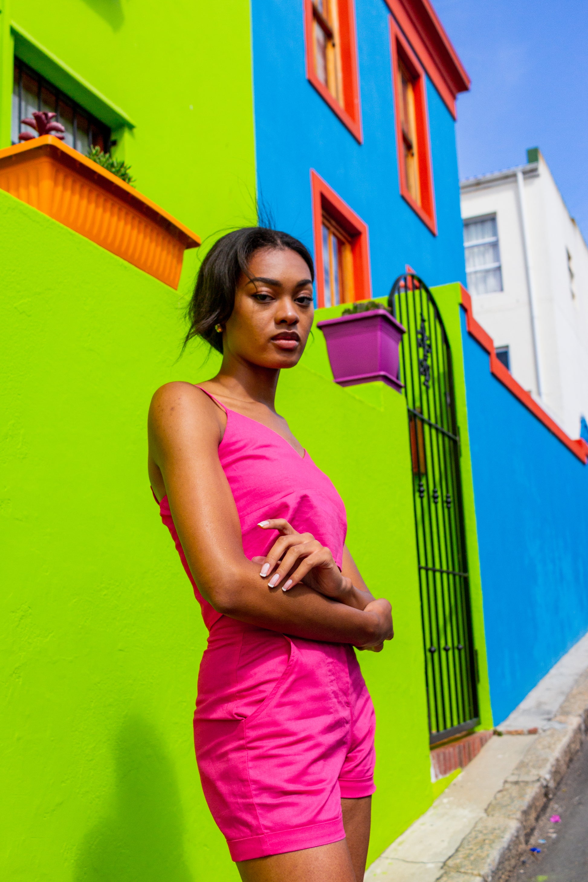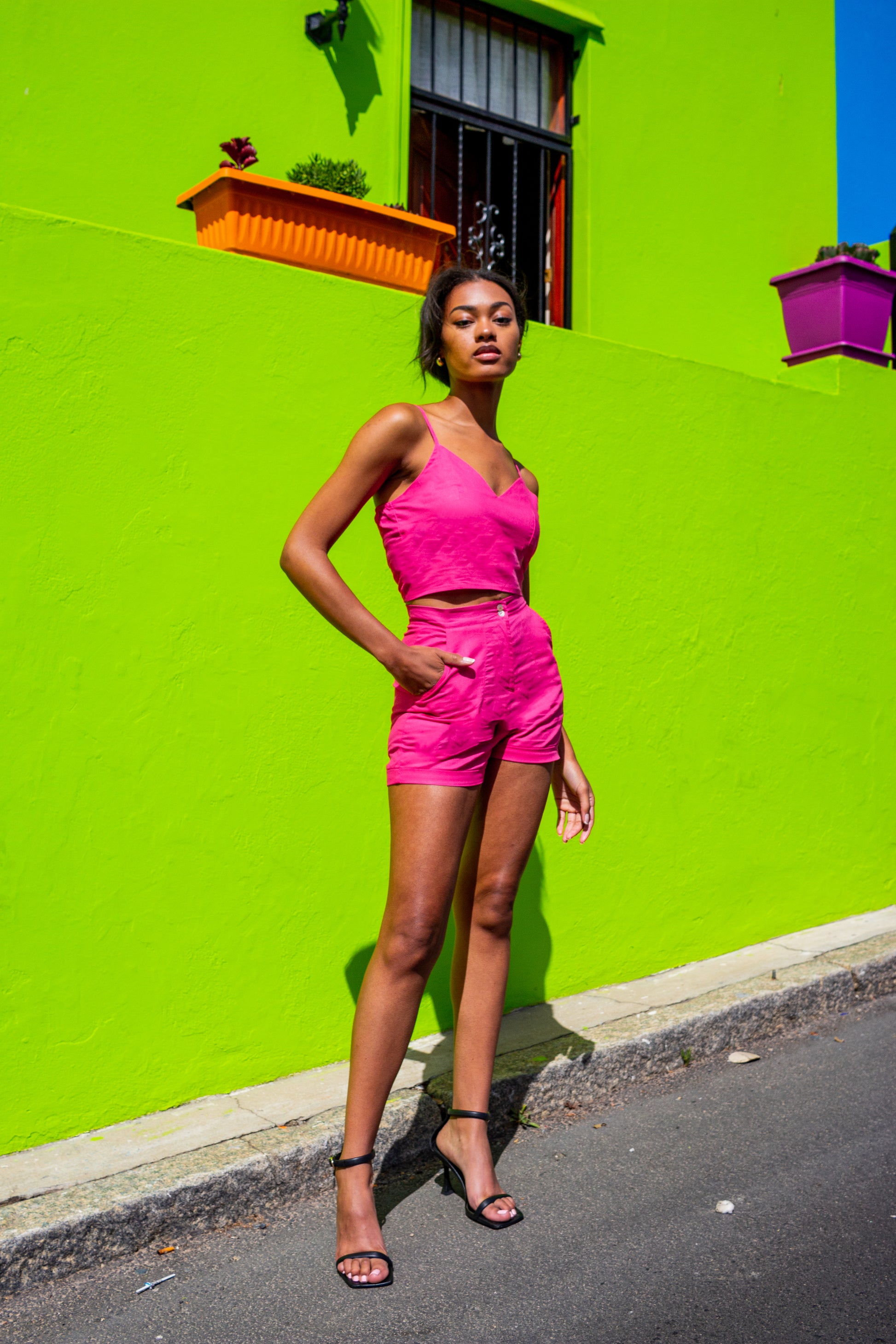 Strap top with v neckline and ruching on back. High waisted shorts.
